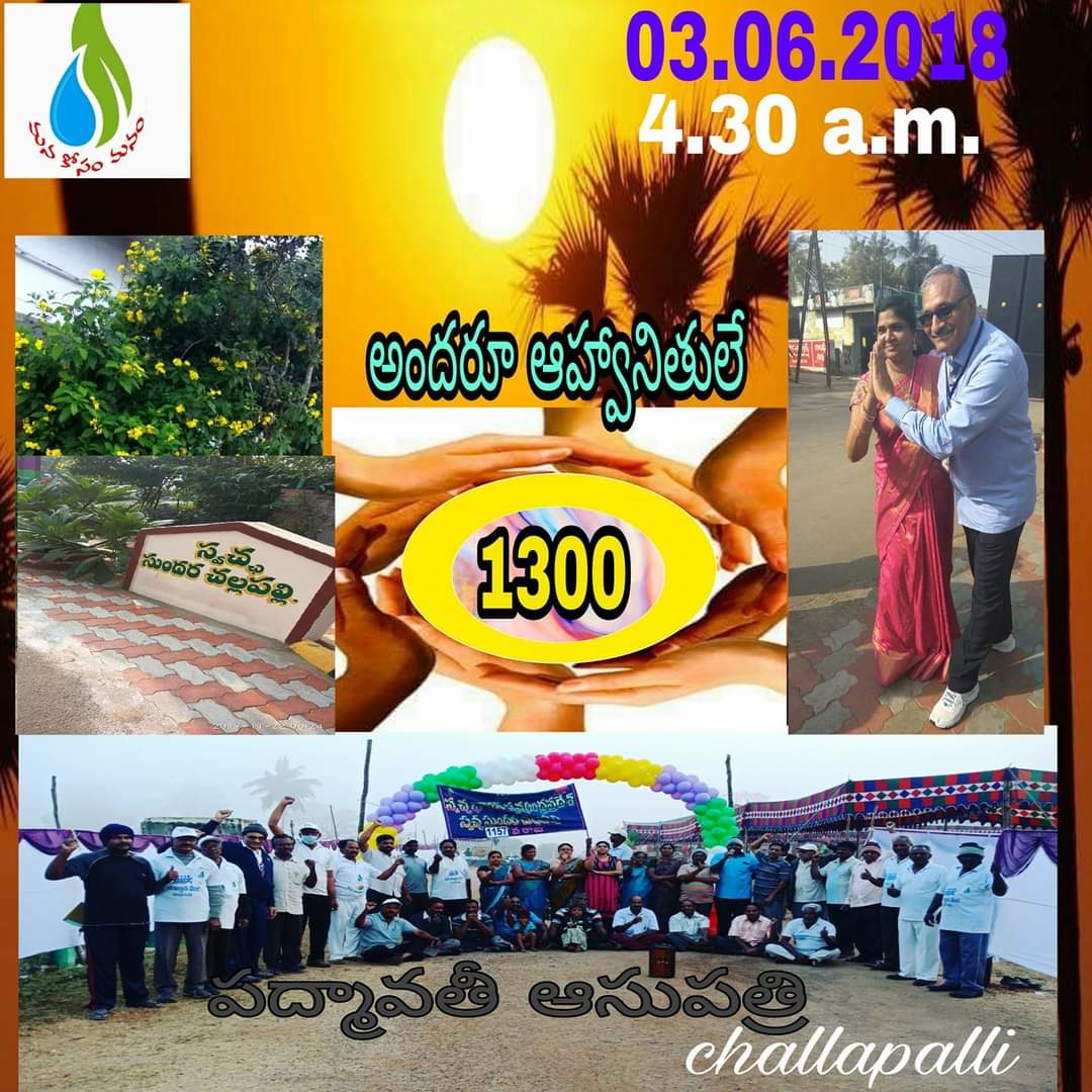 Read Moreసహజీవనము సమభావనము, సమతా భావము గల వారు స్వచ్ఛ చల్లపల్లి కార్యకర్తలు. 1300 వ రోజు సుందర చల్లపల్లి 03.06.2018 న భూతో న భవిష్యతి. ఎవరన్నారో తెలీదు కానీ నిజమేమరి. నవంబరు 12, 2014 న స్వచ్ఛ చల్లపల్లి కార్యక్రమం మొదలైనప్పుడు 15 గురు కార్యకర్తలు. ...