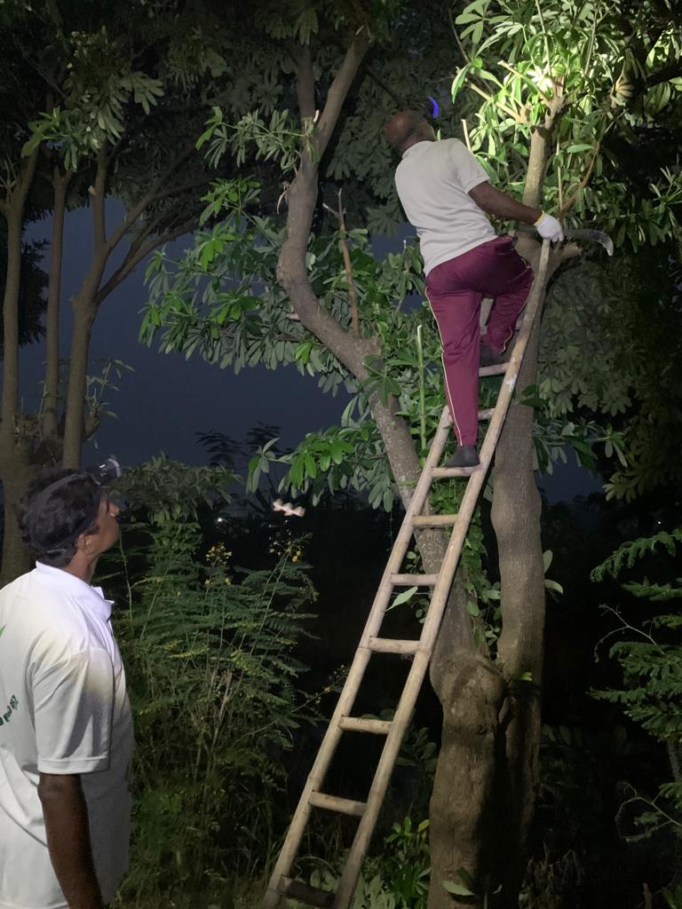 అసలింతకీ “వేకువ చీకట్లో మురుగు నీళ్ల ఒడ్డున చెట్టెక్కే అగత్యమేమున్నది?” అంటే – అంత పెద్ద చెట్ల మీదికి ప్రాకించిన పూల తీగలు కొన్ని పట్టు తప్పి క్రిందకు వ్రేలాడుతున్నవట! నిచ్చెన్ల మీదుగా 4 చెట్లపై కొమ్మలకెక్కి, తీగల్ని బాగా అమర్చడమే నేటి ముఖ్య కార్యక్రమం!