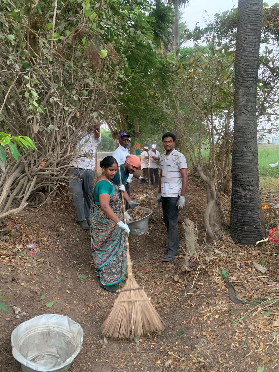 కత్తులు ఝళిపిస్తూనూ - దంతెల్తో వ్యర్ధాల్ని ప్రోగులు చేస్తూనూ - డిప్పల్తో వాటిని ప్రక్క పొలంలోకి చేరవేస్తూనూ - 15 మంది తీరిక లేకుండా కనిపించారు. రహదారిని చీపుళ్ళతో నిష్కళంకపరుస్తూ ముగ్గురు మహిళలు లేస్తున్న దుమ్ములో నుండి లీలగా కన్పించారు!