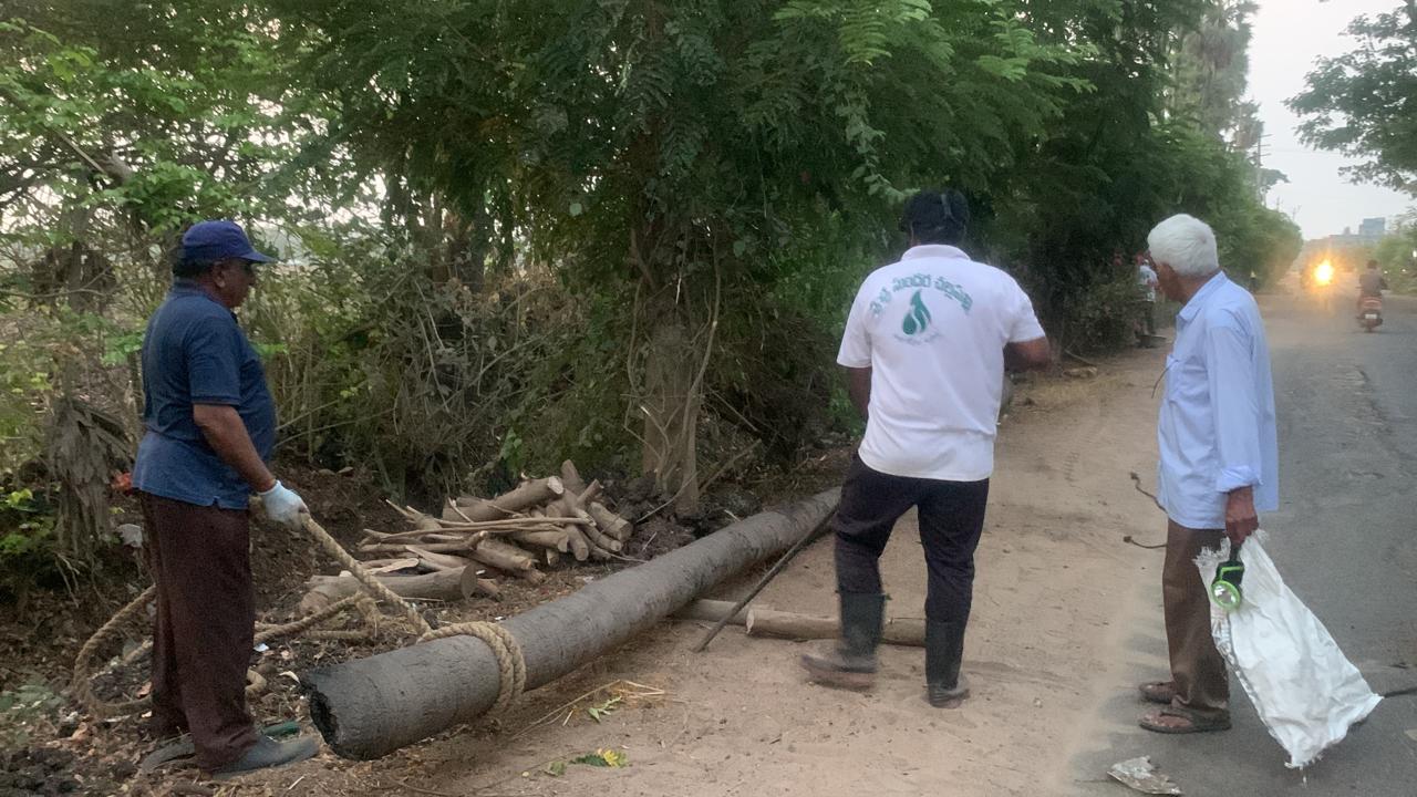 - ఏ బాధ్యతారహితులో నరికి డ్రైన్లో పడేసిన 5 నిలువుల తాడి చెట్లును ముగ్గురు కార్యకర్తలు పైకి లాగి, రోడ్డు వార చెట్ల కానించి, అందంగా సర్దడం,