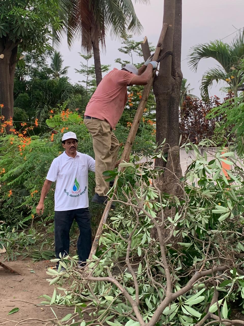 నిన్నటిలా కాక - ప్రకృతి ఈ వేకువ శ్రమదాతలకు సహకరించింది. కాకపోతే ఉక్కపోత మాత్రం తప్పలేదు! పనిచేయకుండా అక్కడ టీ దుకాణం దగ్గర వేడి టీ తాగుతూ బాతాఖానీ వేస్తున్న ఇద్దరికే చెమటలు కారితే - నిచ్చెన్లెక్కి కొమ్మల్నరికే- చీపుళ్లతో వీధుల్ని తుడిచే, పారల్తో రోడ్డు మార్జిన్లను చెక్కి డిప్పలకెత్తి ట్రాక్టర్ లో తరలించి వీధి గుంటల్ని పూడ్చే, NTR విగ్రహం దగ్గర దంతెల్తో డ్రైన్ తుక్కును లాగే కార్యకర్తల సంగతి చెప్పేదేముంది?