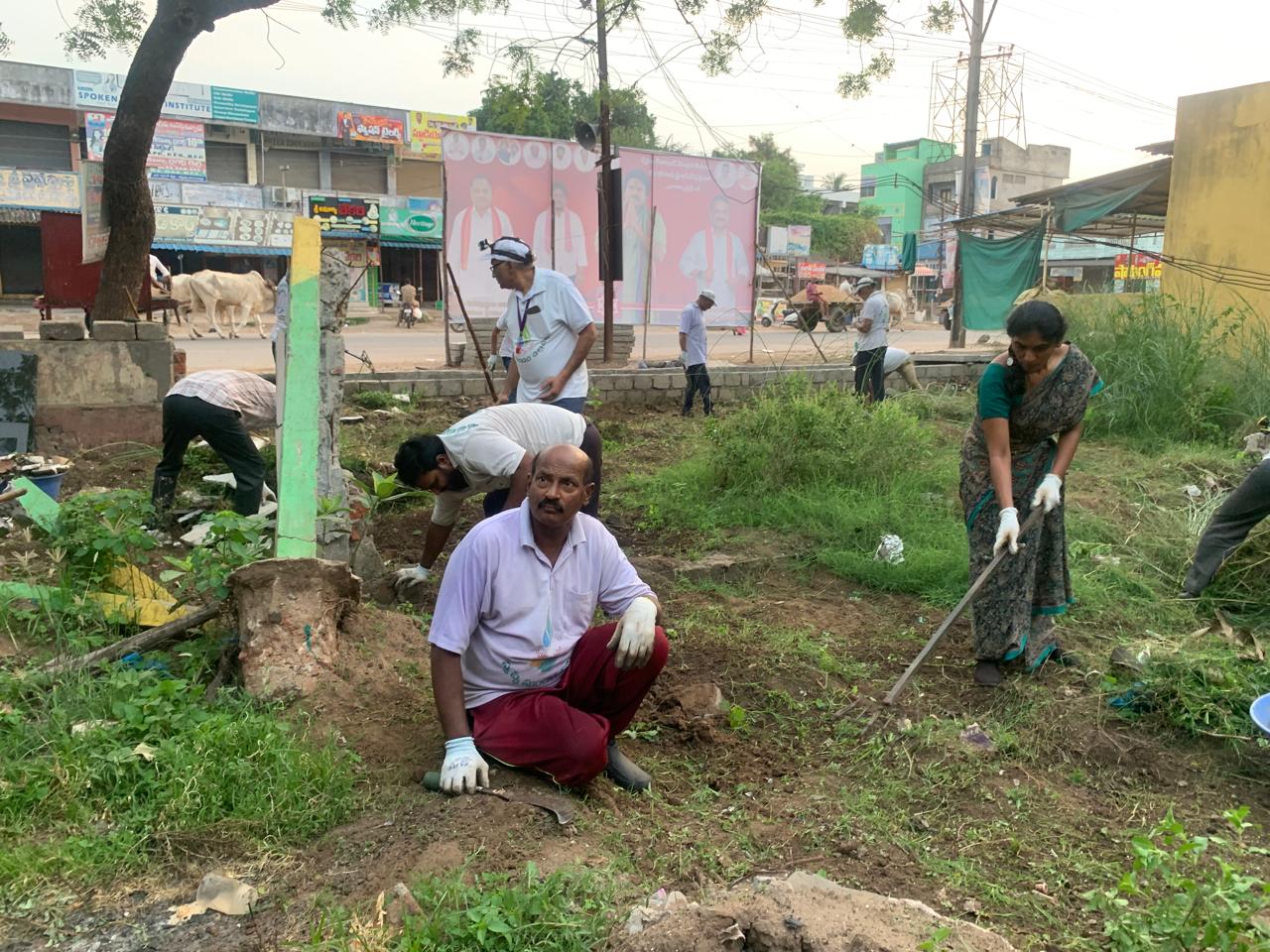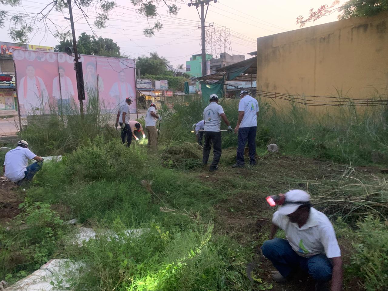 ఈ వేకువ 100 నిముషాల పాటు సదరు ఎగుడుదిగుడు స్థలమే 15 మంది కార్యకర్తల చేతి కత్తులకూ, దంతెలకూ ఊపిరి సలపని పని కల్పించిన ఆరేడు సెంట్లు!