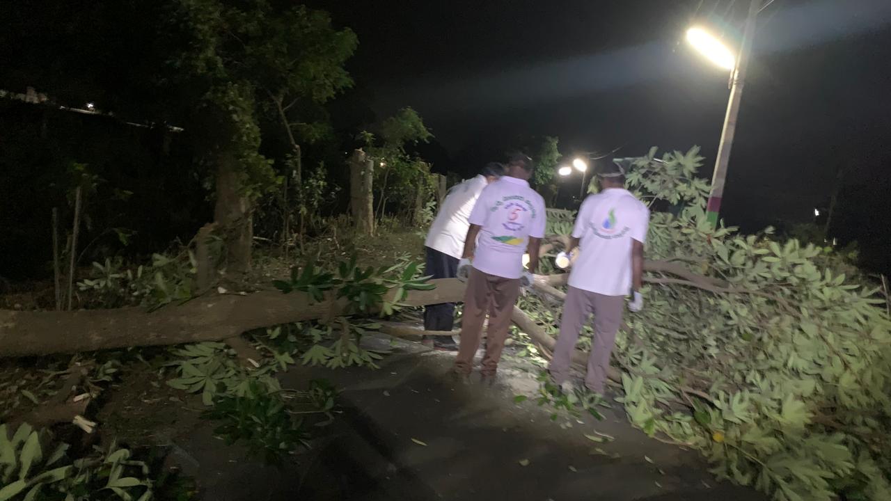 అందులో తొలి విశేషం - 2 మహా వృక్షాల కొమ్మల ఖండనం! ఆ చెట్లు చేసిన తప్పు వాటి నడుమ గల జాతి మామిడి మొక్కల ఎదుగుదల కడ్డుపడడం - అదేదో భరత్ అనే..సినిమాలోలాగా ఐదారేడెనిమిది నాళ్ళ తరువాత గ్రామ బాధ్యతకు వచ్చిన వక్కలగడ్డ రామకృష్ణుడు  1 ¼  చెట్టు కొమ్మల పనిని పట్టినట్లూ, మిగిలిన పని చెట్ల నరుకుడులో సిద్ధహస్తులు ముగ్గురు పూర్తి చేసినట్లూ తెలిసింది!