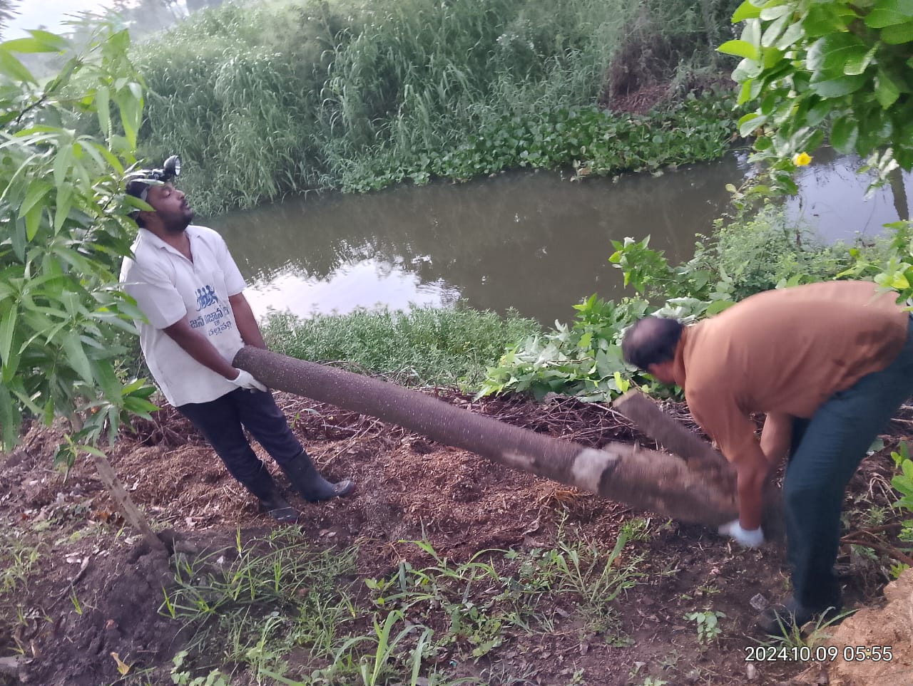 - వాటిలో మొదటిది - నేను రహదారికి చేరుకోకముందే మురుగుకాల్వలో జరుగుతున్న 8 మంది శ్రమ విచిత్రం! అందులో ఇద్దరైతే మురుగు లోతులో దిగి అక్కడ పెరిగిన చెట్టు కొమ్మల్ని చెండాడి, మోకులు కట్టడమూ, బైటకు లాగి రోడ్డు పటిష్టతకు నీటి అంచున అమర్చడమూ! నీళ్ళలో పడి మునుగుతాడనేమో - ఒకాయన నడుముకు త్రాడు బిగించుకొన్న వైనం ఫొటోలో మీరూ చూడవచ్చు!