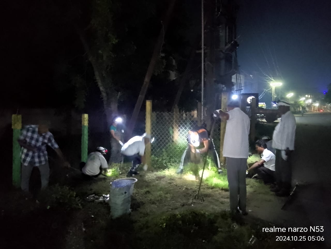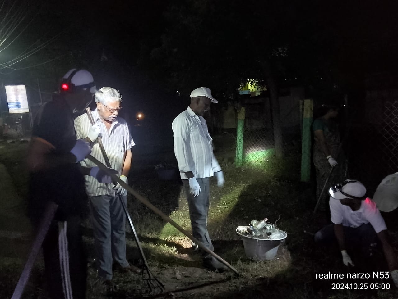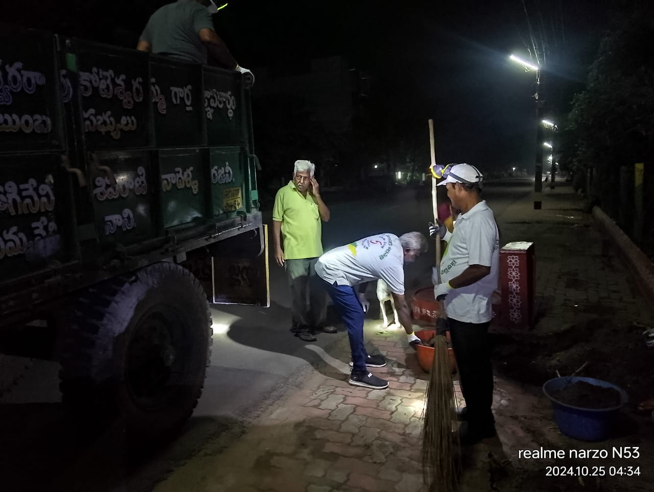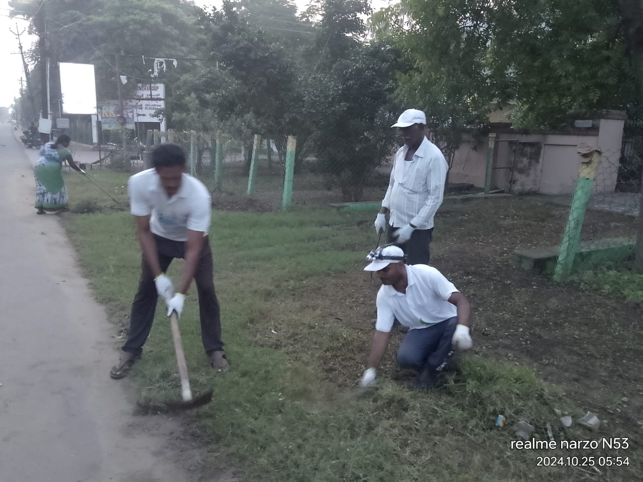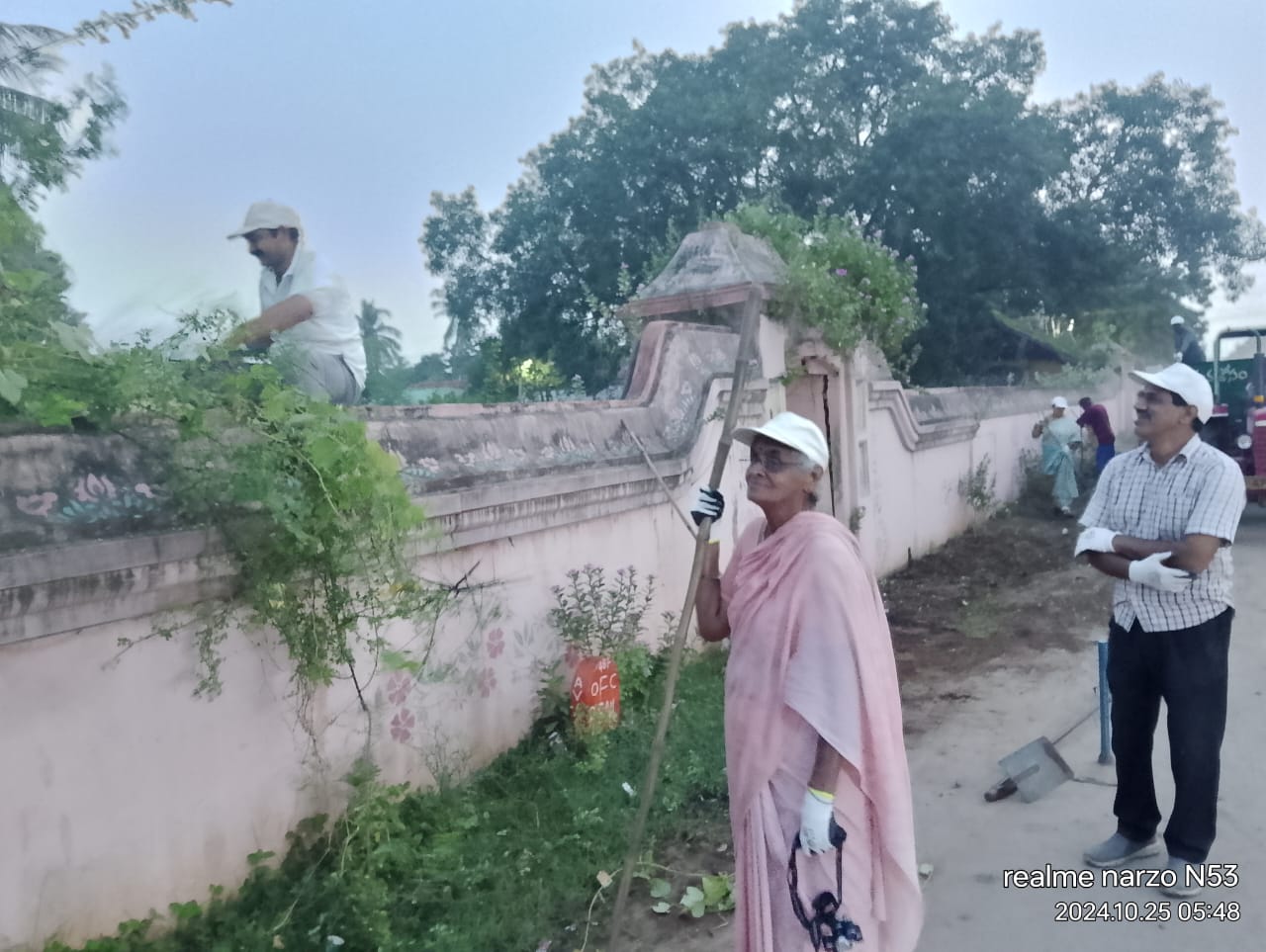 ట్రాన్స్ఫార్మరు ఫెన్సింగులో దూరిన ఒక రైతు ముఖ్యుడూ, మరొక రోటరీ ప్రముఖుడూ గడ్డి పరకల్నీ, కొబ్బరిబొండాల వ్యర్థాలనీ, ఖాళీ సారా / శీతల పానీయ సీసాల్నీ ఐదారు డిప్పలు బైటకు లాగారు! అక్కడికి తూర్పు పడమర జాగాలను 15 మంది ఎంత శ్రమిస్తే ఇప్పుడింత చక్కగా కనిపిస్తున్నది?