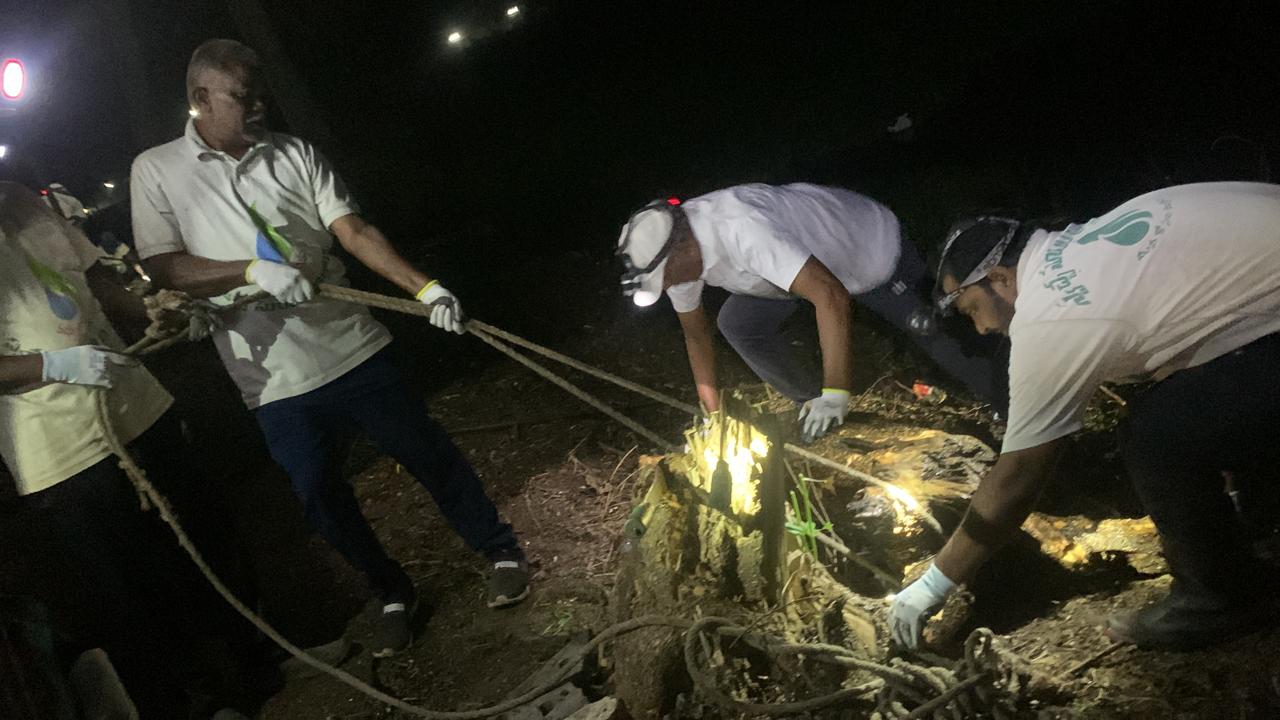 3) 3 గ్గురు వీధి ప్రక్క బాగా పెరిగిన కొమ్మల్ని ఖండించి, ట్రాక్టర్ లోకి ఎక్కించారు.