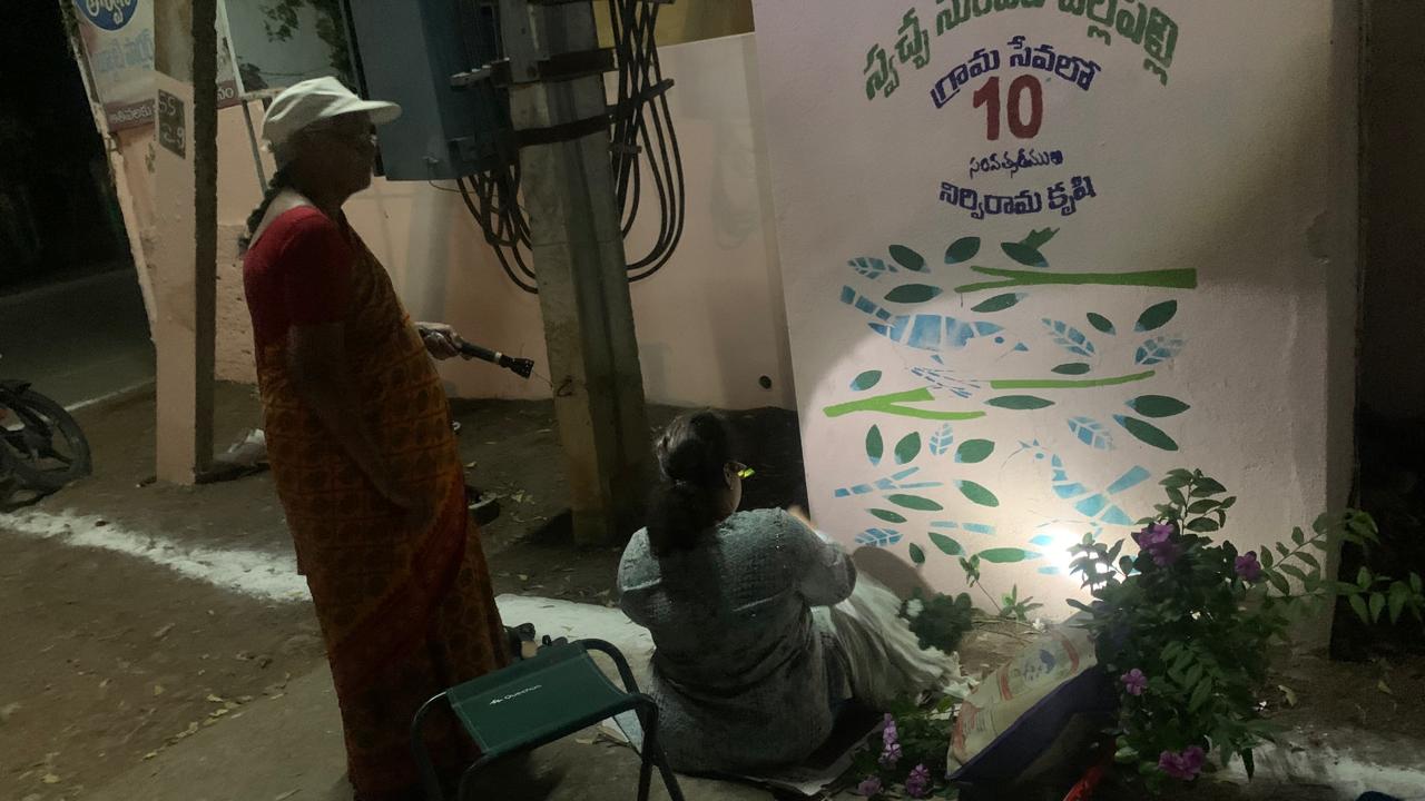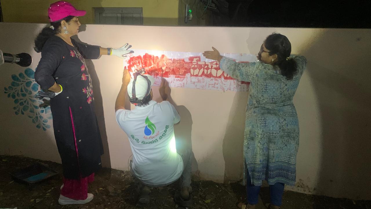 ఇక్కడికి దూరంగా వైజయంతం ప్రహరీ తూర్పు భాగాన్ని నెమళ్ళ, పూల, చిరు పక్షుల చిత్రాలతో నింపుతున్న స్వచ్చ సుందర కళాకారులకీ