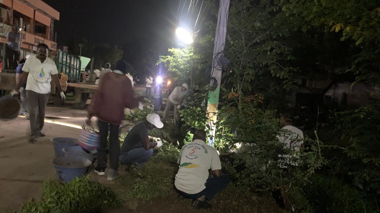 ప్రధాన బైపాస్ రహదారిలో కార్యకర్తలు క్రిక్కిరిసి పనులు చేస్తుండగా, షణ్ముఖ ఎలక్ట్రానిక్స్ వీధినీ, మురుగుకాల్వనూ బాగుచేసి సంతోస్తున్న ఇద్దరు వియ్యపురాళ్ల కష్టం!