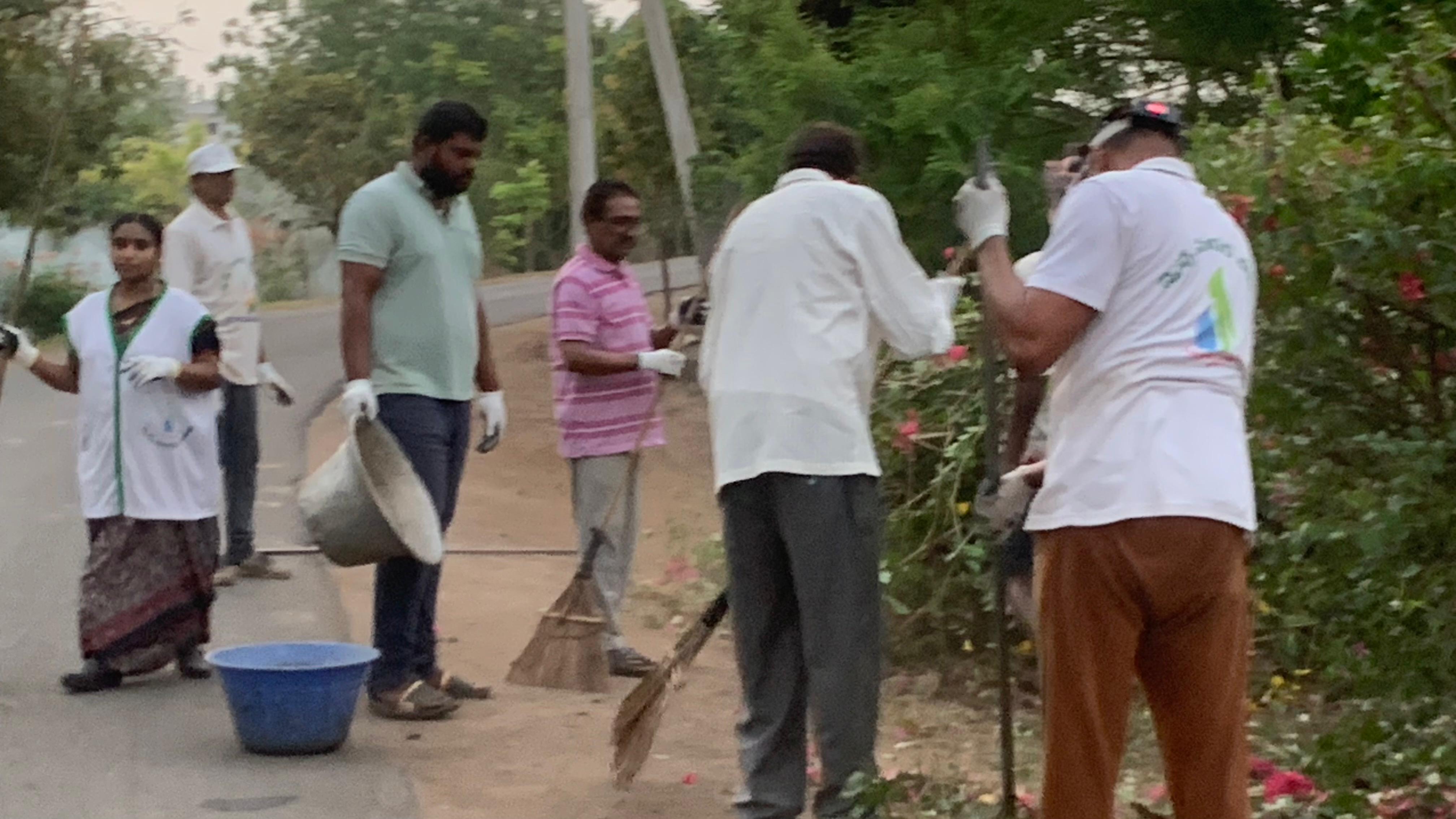 పెరిగి రోడ్డు మీదకి వస్తున్న సువర్ణ గన్నేరు, కాగితపు పూల చెట్లను కత్తిరించి అందంగా తయారుచేసే పనిలో ఇద్దరు కార్యకర్తలు నిమగ్నమవగా కత్తిరించిన కొమ్మలను ఈరోజు షెడ్దర్ లో వేయడానికి సౌకర్యంగా తొడుగు వేయువారు మరికొందరు. మహిళా కార్యకర్తలు మాత్రం సూక్షంగా ఉన్న కాగితపు మొక్కలు సైతం ఊడ్చి పోగు చేయడం ఎంతో నైపుణ్యమైన పని.