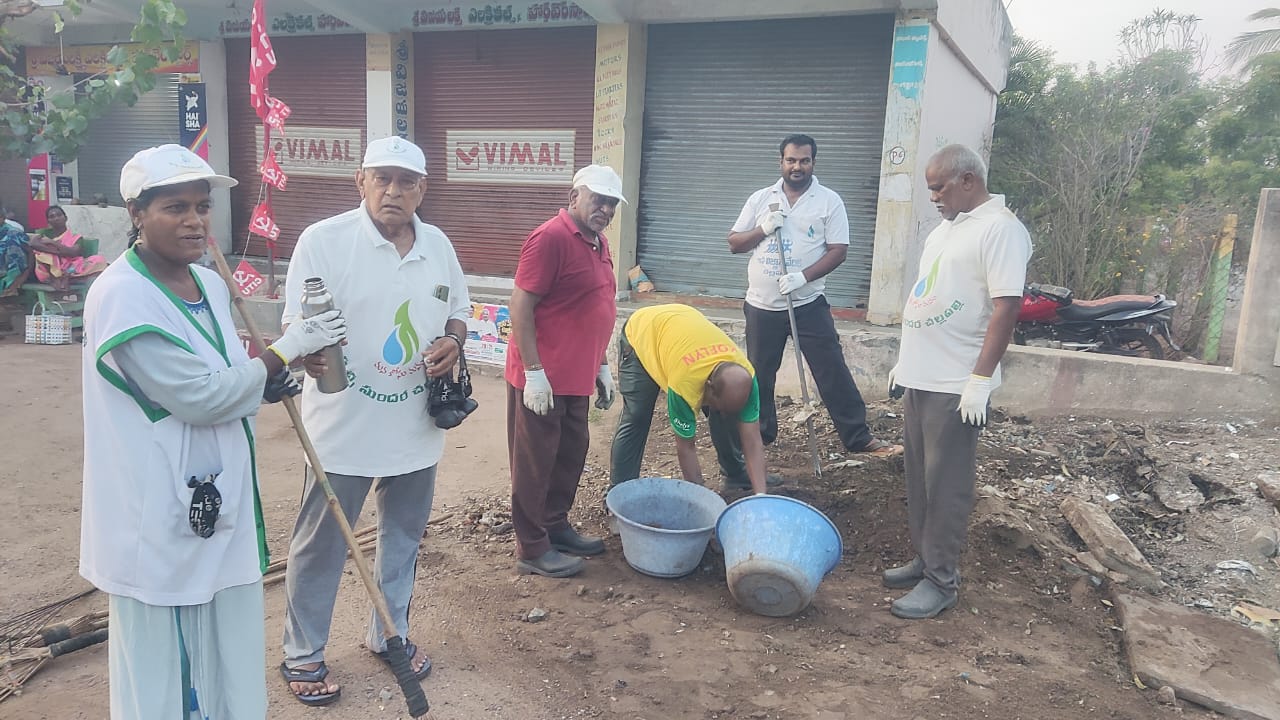 నిన్నటి భాగంలో మిగిలిన కొద్ది పనిని కోడూరు వారు, శంకర్రావు బృందం పూర్తి చేయగా మరికొంతమంది రేపటి పనికి కొనసాగింపుగా మెయిన్ రోడ్ లోని కొంత భాగం శుభ్రపరచి, చెమటలతో తడిసి ముద్దయినా గ్రామ సేవకై మొక్కవోని దీక్షతో పనిపాటల సోదరులె పునాదులు ఈ భువనానికి అన్నట్లుగా శ్రమించి 6 గం.లకు పని విరామంతో కొద్ది నిమిషాలు కాఫీ కబుర్లతో గడిపారు.