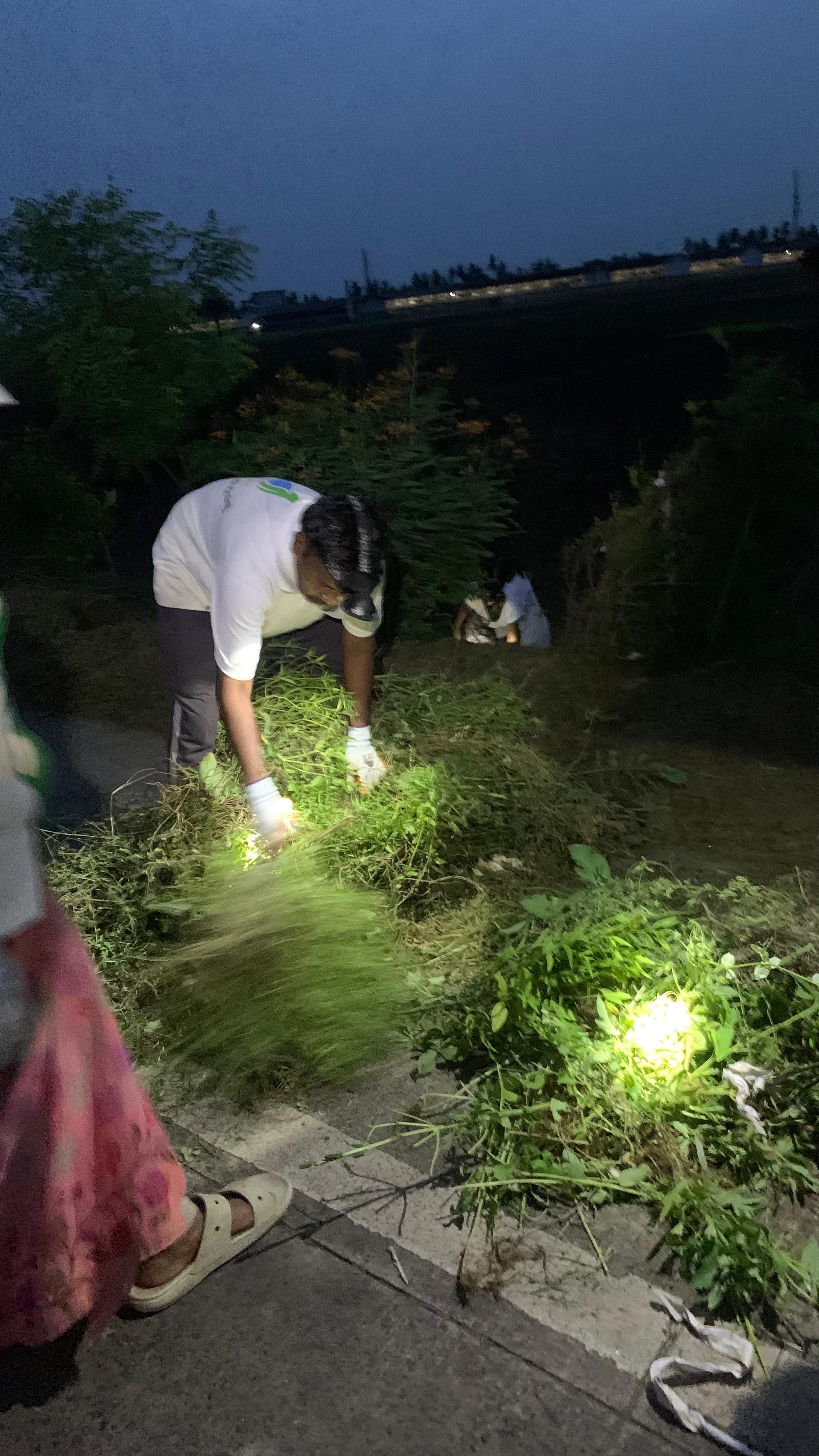 216 జాతీయ రహదారి పైనే గత నెలరోజులు పైగా జరుగుతున్నటు వంటి స్వచ్చ సేవలకు కొనసాగింపుగా ఈరోజు తెల్లవారుజామున 4:13 నిమిషాలకు 17 మంది కార్యకర్తలు క్లబ్ రోడ్ కు అతి సమీపంలో పనికి సిద్దమయ్యారు. గత సంవత్సరకాలం క్రితం మొక్కలు నాటిన దగ్గర నుండి మధ్యలో ఒకటి రెండు సార్లు ట్రస్టు కార్మికులు ఆ ప్రాంతంలో పని చేశారు. దాని వలన గడ్డి, పొదలు, జిల్లేడు చెట్లు దట్టంగా పెరిగి కార్యకర్తలకు ఊపిరి సలపనంతగా కావలసినంత పని అక్కడ సిద్దంగా ఉంది.