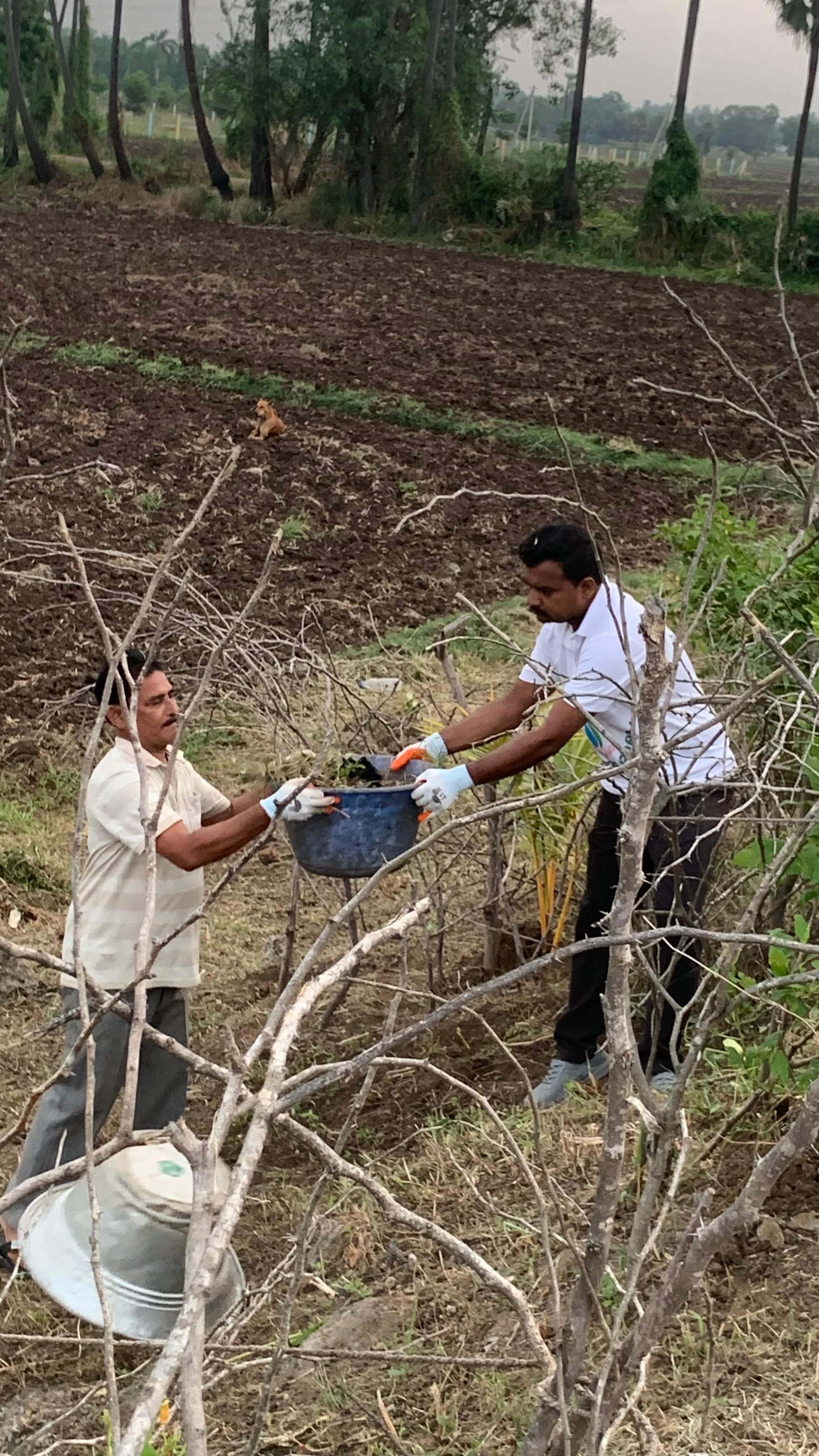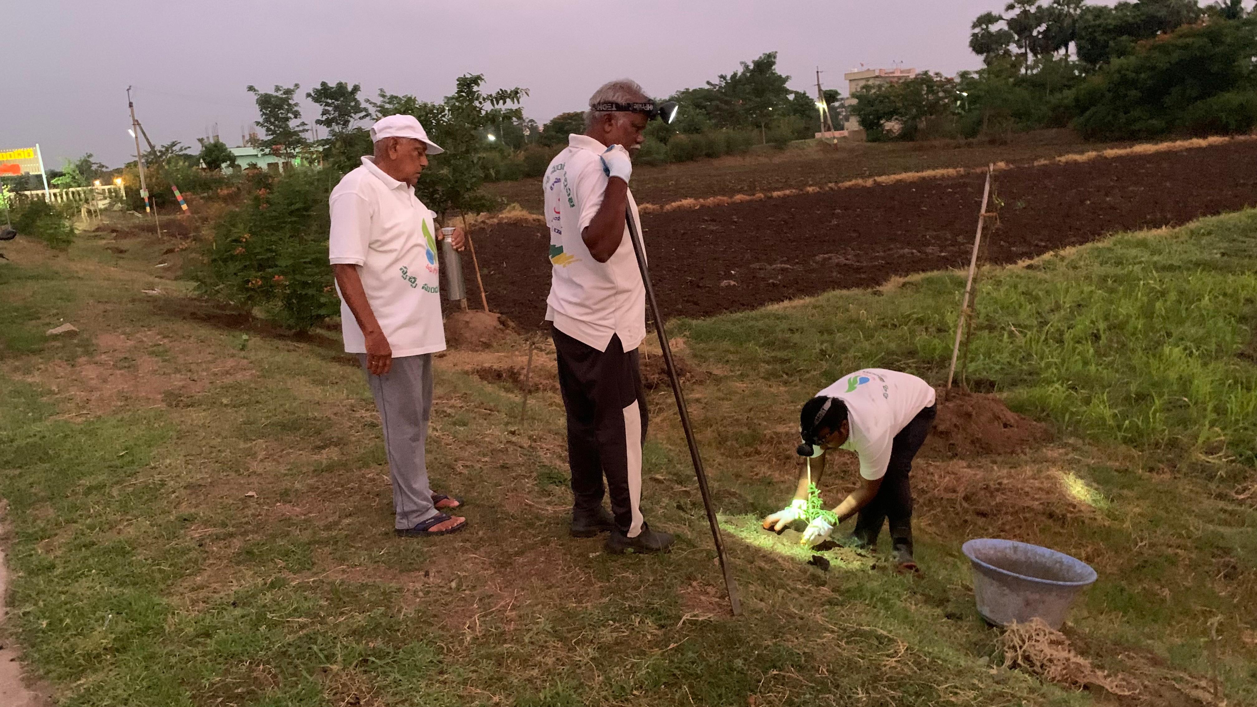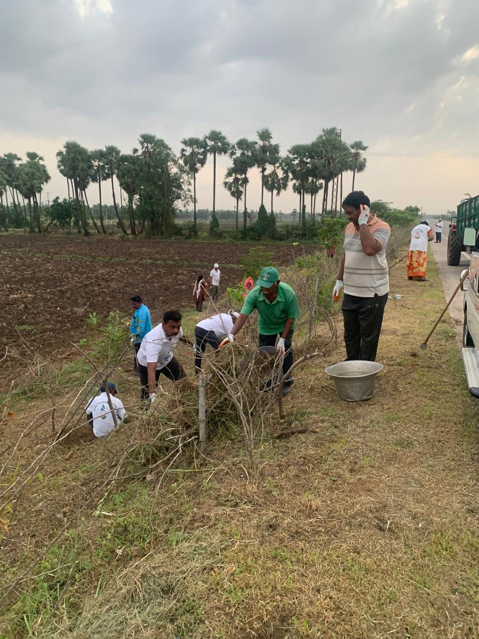 మరికొద్దిమంది కార్యకర్తలు పెద్ద, చిన్న మొక్కలకు పాదులు చేసుకుంటూ మొదళ్ళకు మట్టిని బలం చేస్తూ వస్తున్నారు. రోడ్డు దిగువ భాగాన ఉన్న మరికొన్ని మొక్కలకు పాదులు చేసి మట్టి బలంగా వేయవలసిన పని కొంత మిగిలి ఉంది.