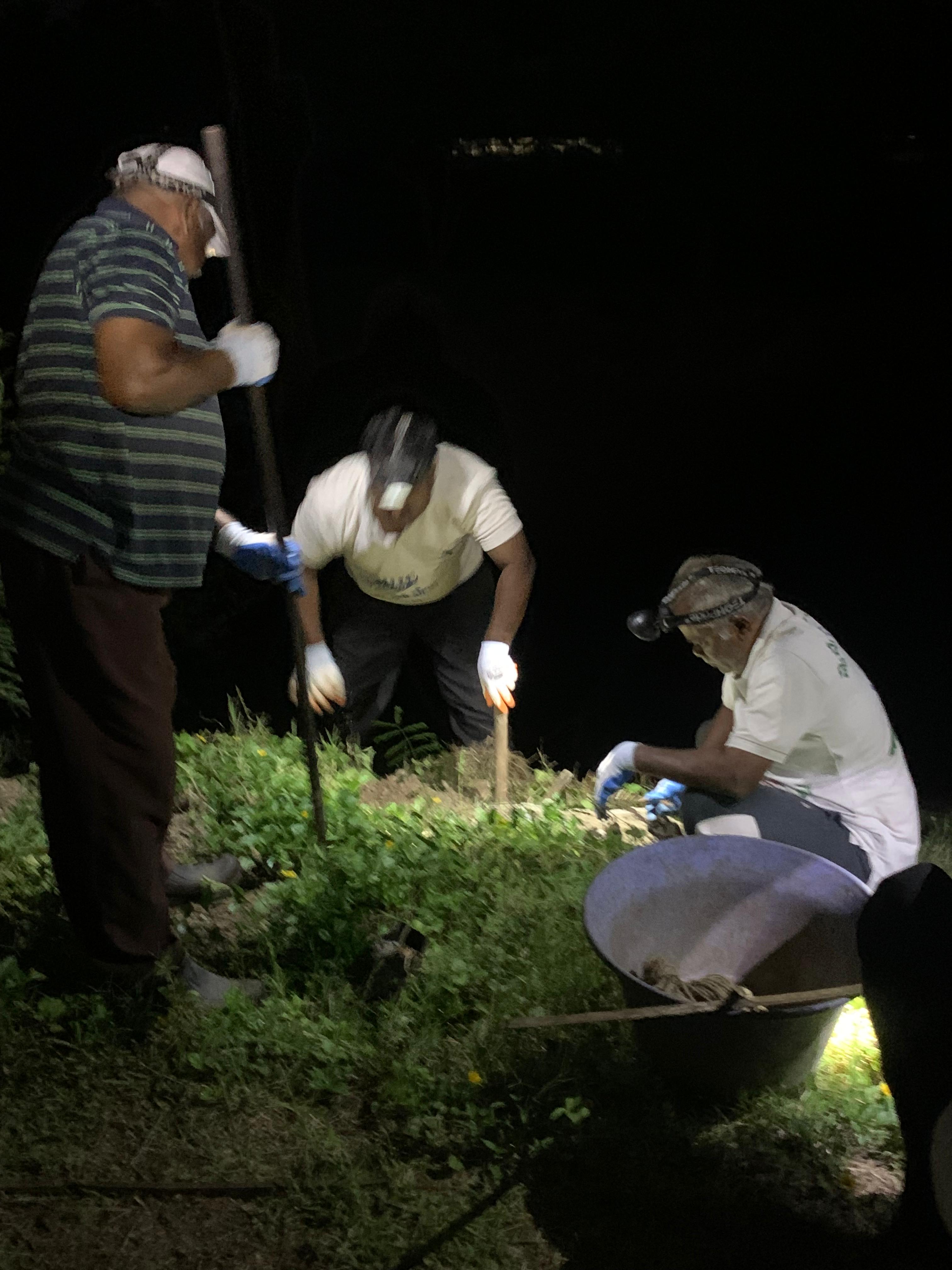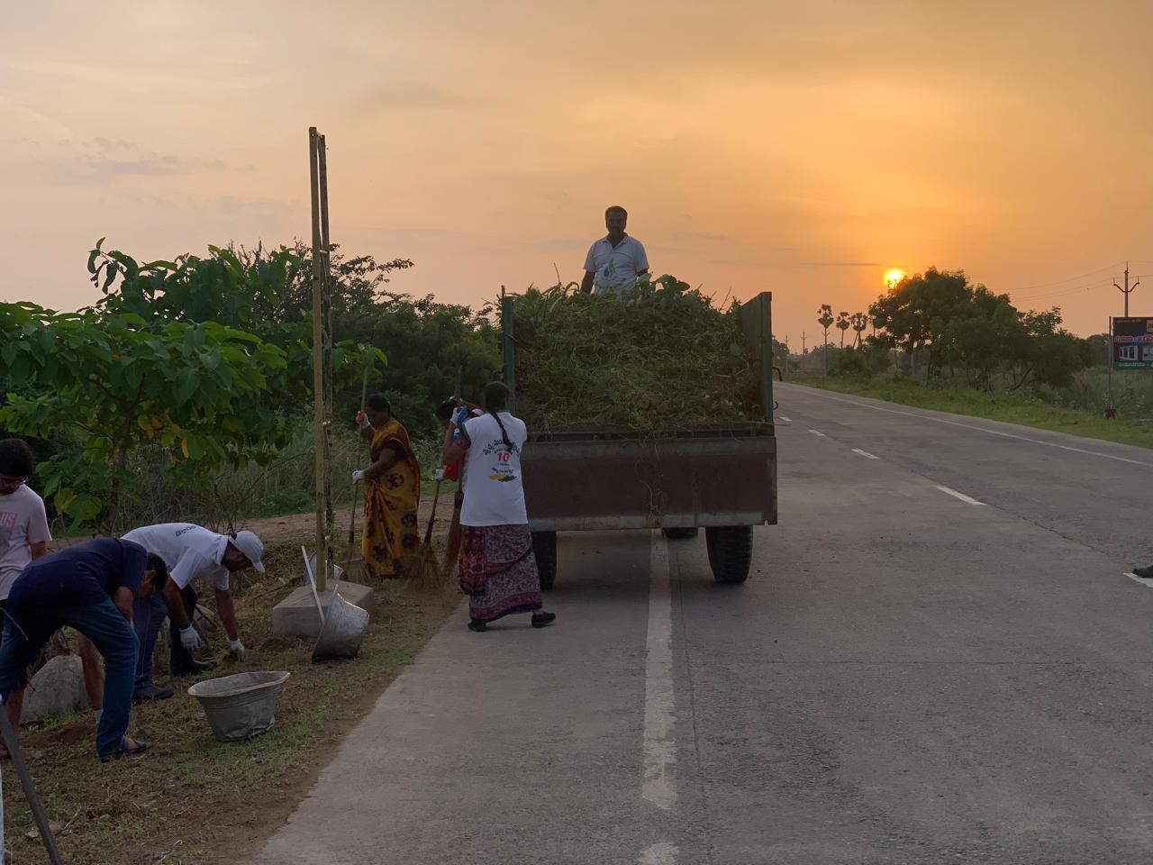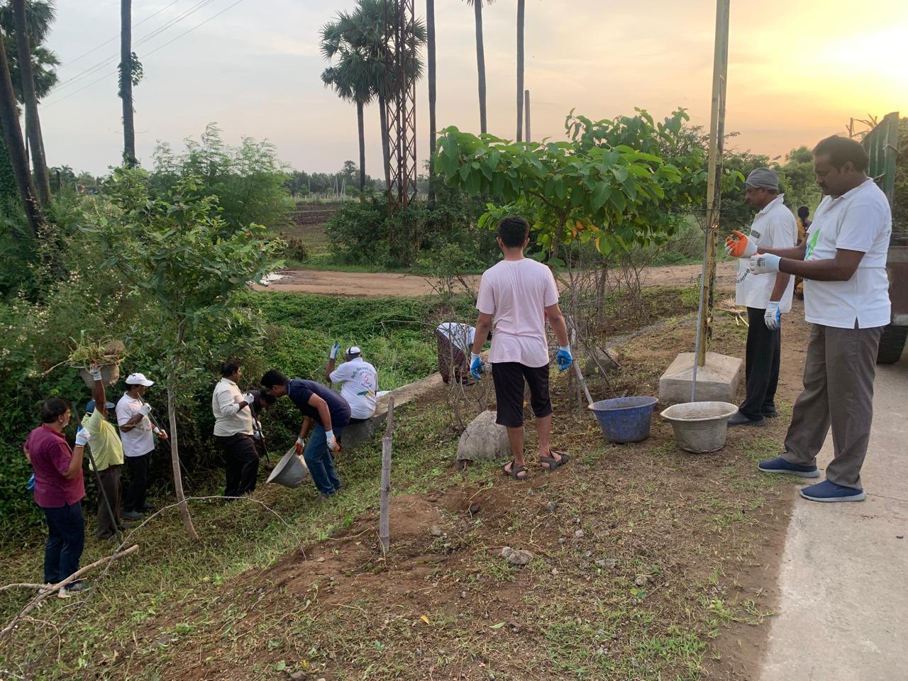 పని చేయగా వచ్చిన తుక్కును వేరు వేరు చోట్ల కోతకు గురై మట్టి కొట్టుకు పోకుండా ఆ గాడిలో వేసి సర్దినారు. ఒక కార్యకర్త మిషన్ తో అక్కడక్కడా మిగిలిన భాగాన్ని కత్తిరిస్తుండగా, కొద్దిమంది కార్యకర్తలు వరుస క్రమంలో పోయిన మొక్కలను నాటుతూ వాటికి పాదులు చేస్తున్నారు.