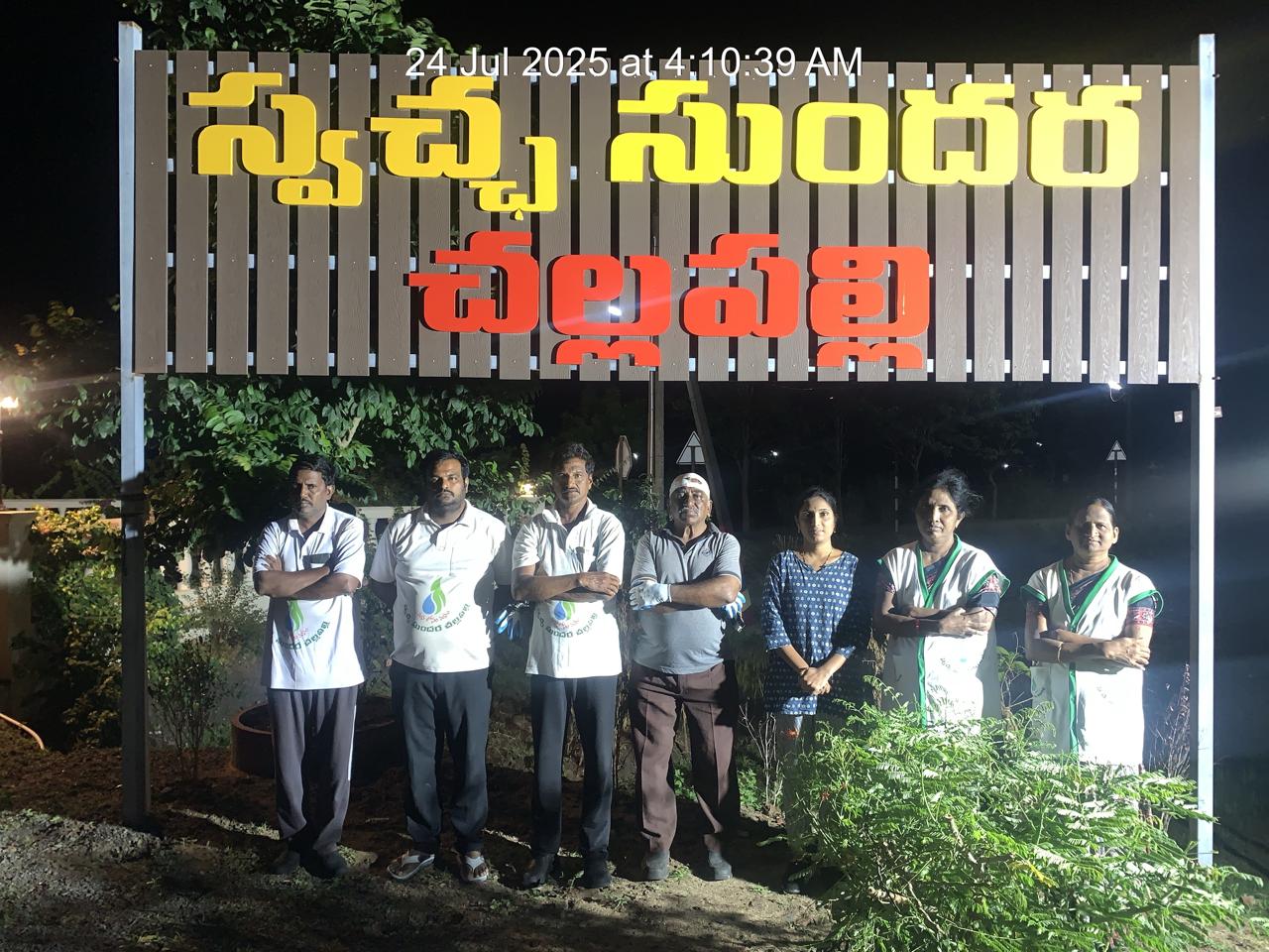 తెల్లవారుజాము 4.10 నిమిషాలకు స్వచ్చ సుందర చల్లపల్లి బోర్డు వద్ద 8 మంది కార్యకర్తలు ఫోటో దిగి ఆ తరువాత వారివారి పనిముట్లు చేతబట్టి పని ప్రారంభించారు.