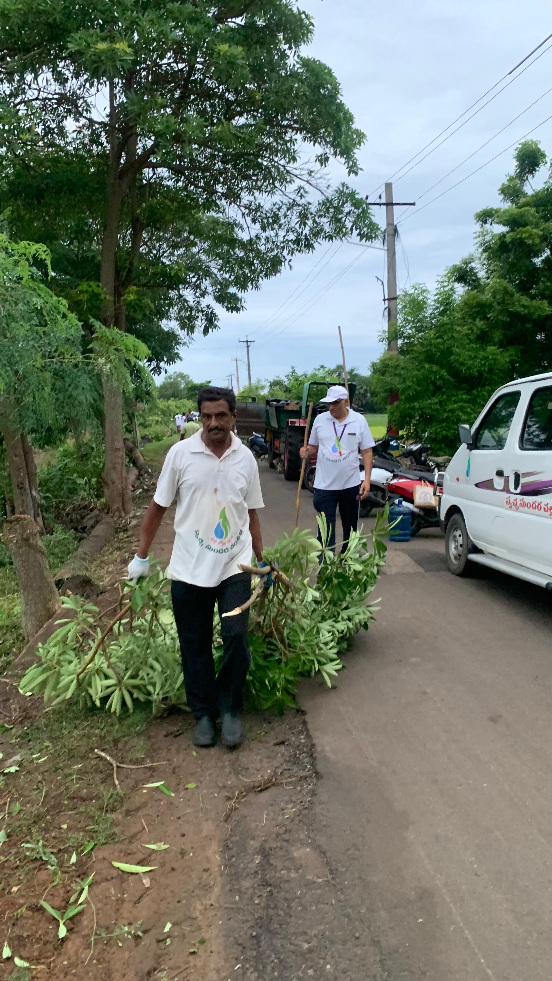 ఒక కార్యకర్త రోడ్డు ప్రక్కల అందవిహీనంగా అడ్డదిడ్డంగా ఉన్న చెట్ల కొమ్మలను ట్రిమ్మర్ సహాయంతో కట్ చేసి ఆ కొమ్మలను రోడ్డుకు దన్నుగా క్రింది భాగంలో ఒక క్రమపద్దతిలో ఇద్దరు కార్యకర్తలు సరిచేశారు.