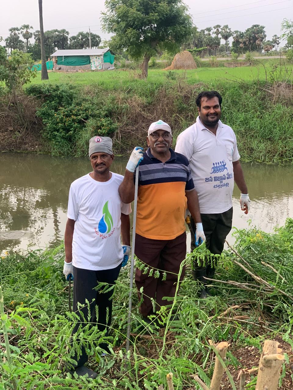 ముగ్గురు కార్యకర్తలు డ్రైనేజి లో ఉన్న నీరు సరిగ్గా పారక చెత్తతో అడ్డుపడిపోతే ఆ డ్రైన్ కి దారిని చూపించారు.