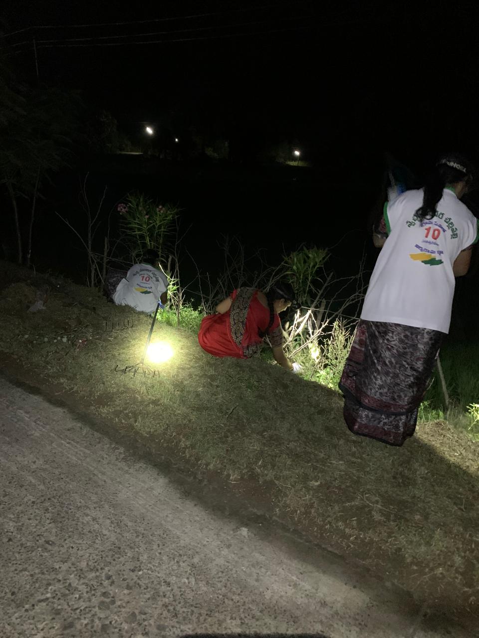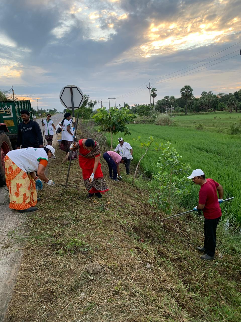 రోడ్డుకు దిగువ భాగాన చేతులతో, కత్తులతో, పంజాలతో గతంలో నాటిన మొక్కల చూట్టూ చిత్తుచిత్తుగా పెరిగిన పిచ్చి గడ్డిని, కలుపును పీకి గుట్టలుగా పోగేసారు.