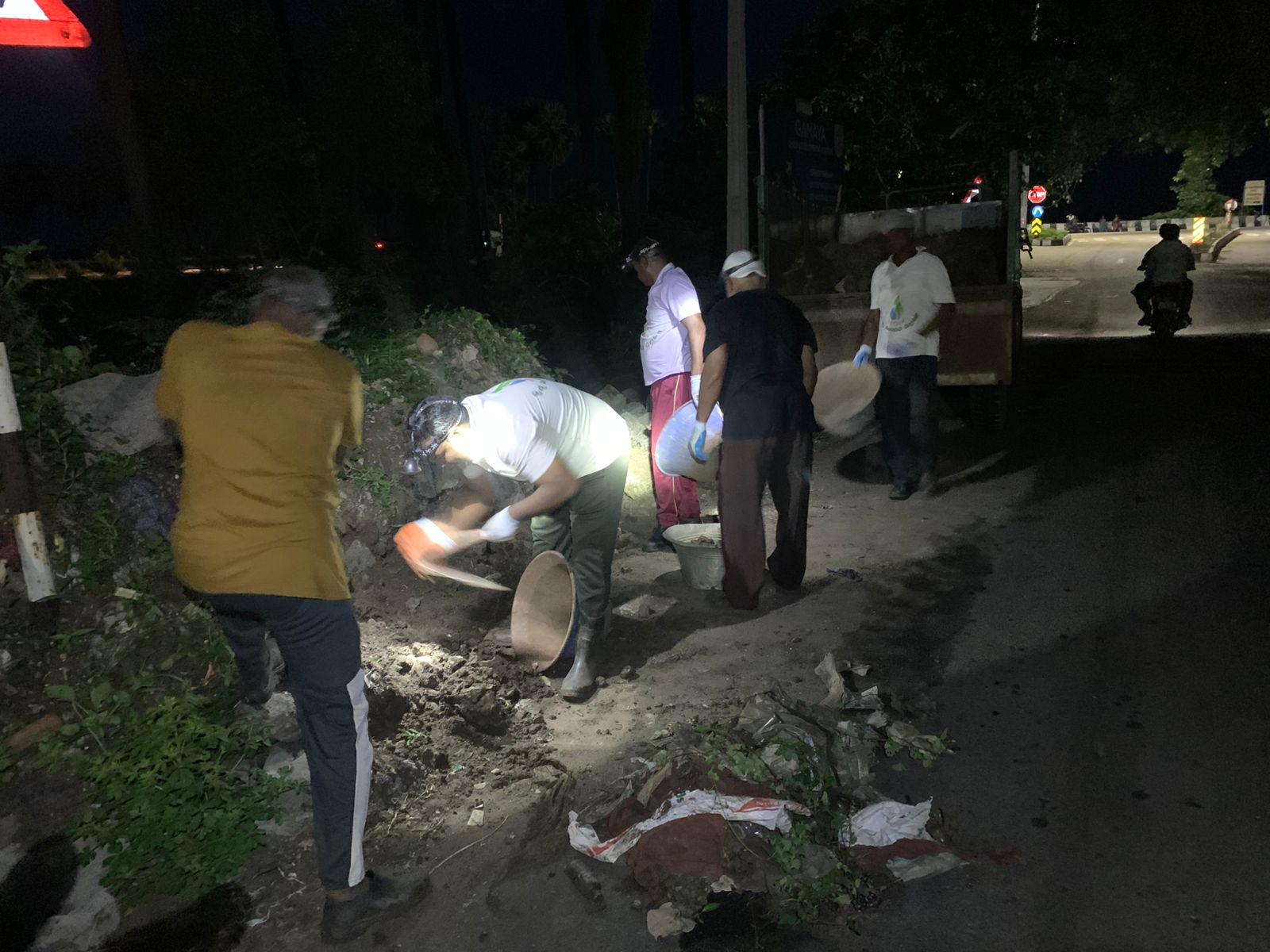 మరొక బృందం కాసానగర్ జంక్షన్ వద్ద కోతకు గురి అవుతున్న మెయిన్ రోడ్ అంచును పరిరక్షించే పనిలో ఈరోజు పై భాగంలో మట్టి నింపడం చేశారు. హైవే రోడ్ ప్రక్కన మొక్కలలో పని చేసినంత సేపూ షుమారు 2 గంటల సమయం పాటు ఏటవాలుగా ఉన్న ఆ ప్రదేశంలో ఒక కాలుపై మాత్రమే బలం మోపి నిలబడి పని చెయ్యడం ఏమాత్రం సులువైన పని కాదు. కానీ ఇక్కడ కార్యకర్తకు కావలసినది చల్లపల్లి స్వచ్చత మాత్రమే..