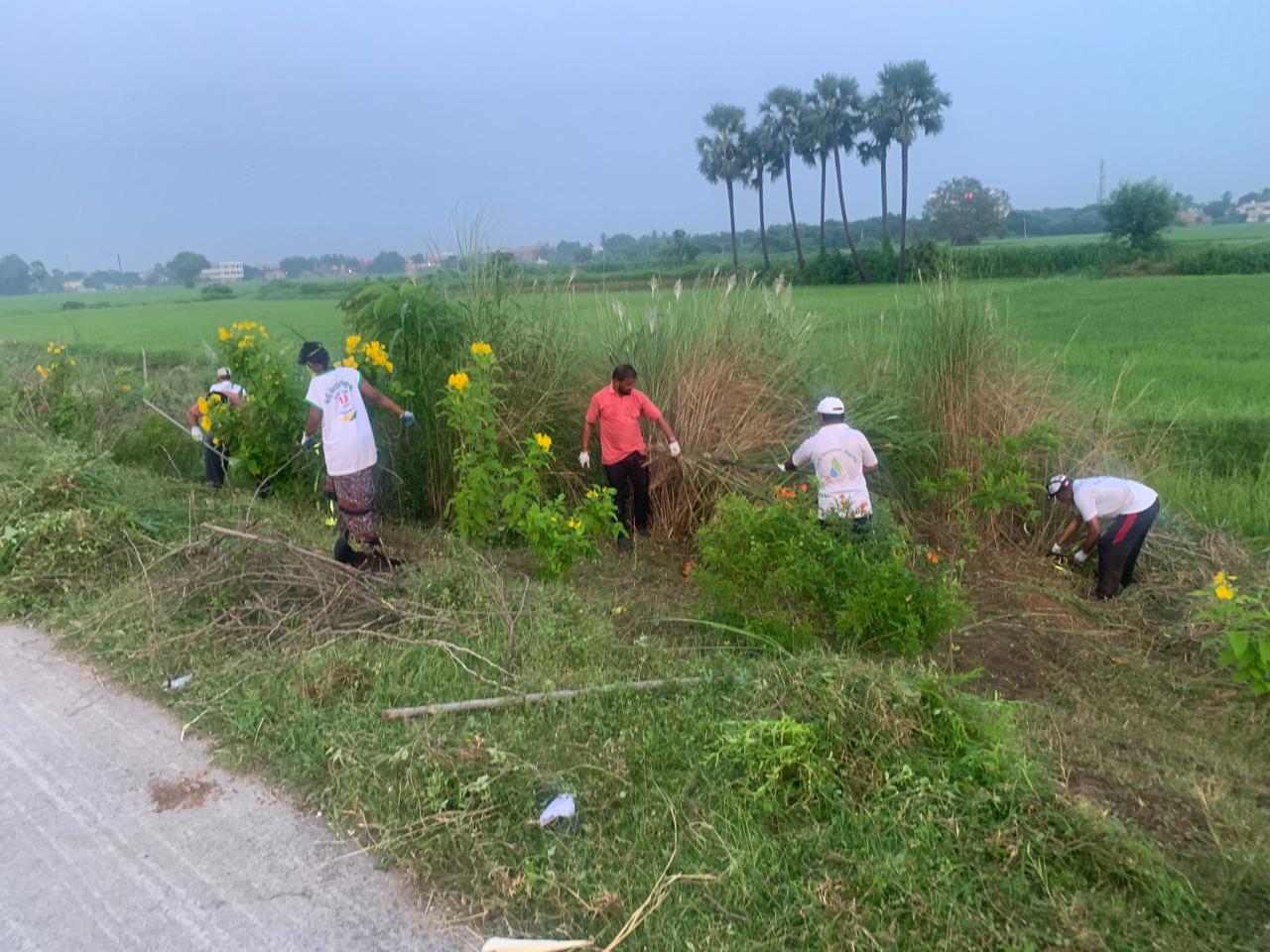గడ్డి కటింగ్ మిషన్ తో ఒక కార్యకర్త రహదారి క్రింది భాగంలో దట్టంగా పెరిగిన గడ్డిని క్రిందికంటూ కట్ చేస్తున్నారు. మహిళా కార్యకర్తలలో కొంతమంది వచ్చిన చెత్తను పోగులుగా పేర్చడం చేయగా మరికొంతమంది కత్తులు, పంజాలు, కొడవళ్ళు చేతబట్టి గడ్డి కోసే పనిలో చాలా నైపుణ్యం కనబరిచారు.