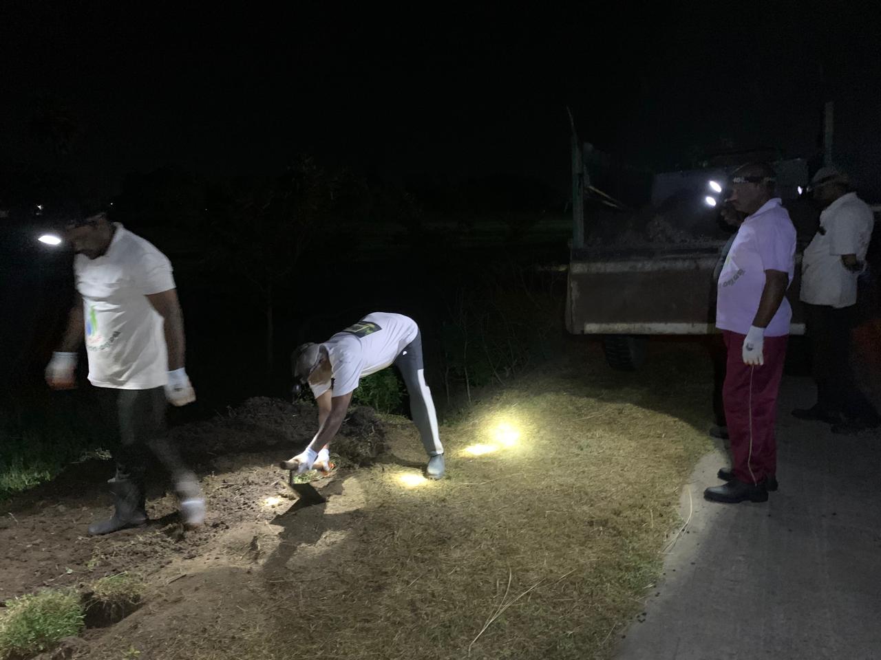 ముగ్గురు కార్యకర్తలు స్వాగత ద్వారం సమీపంలో కొన్ని సువర్ణ గన్నేరు మొక్కలకు కంప కట్టడం, కర్రపాతడం చేశారు.