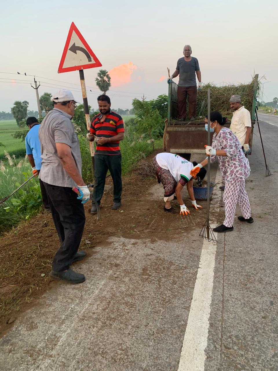 జాతీయ రహదారిపై తెల్లవారుజాము 4:15 నిమిషాలకు ఈరోజు శ్రమదాన కార్యక్రమం మొదలైంది. హైవే రోడ్ ప్రక్కనే అనగా రహదారికి ఎడమ వైపు (అవనిగడ్డ వైపు) న దట్టంగా పెరిగిన రెల్లు గడ్డిని, పిచ్చి మొక్కలను పూర్తిగా నిర్మూలించే పనిలో మొదలకంటూ కొట్టడం జరిగింది.