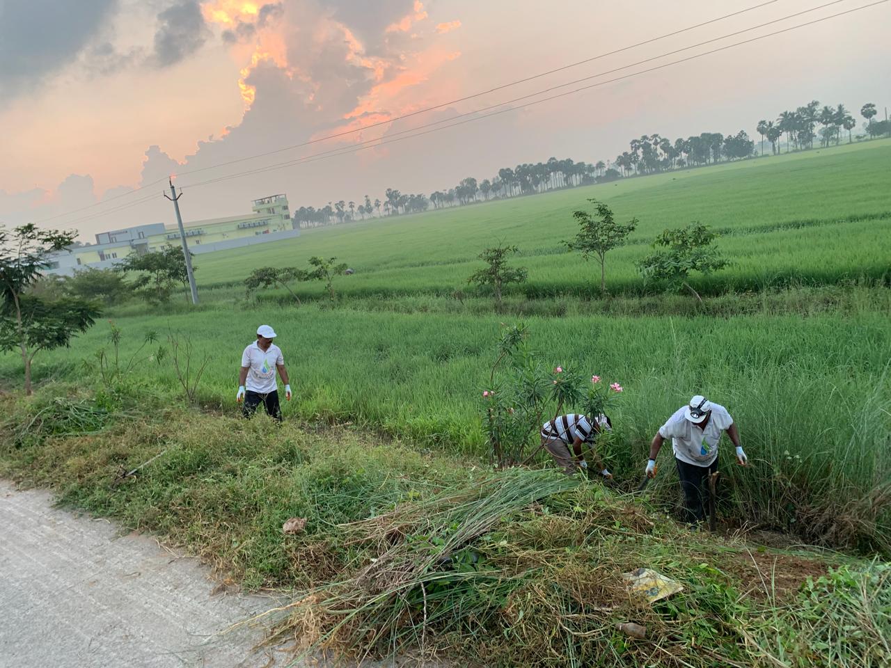 హైవే లో గత 2 సంవత్సరాల క్రితం నాటిన మొక్కలను పరిరక్షించే పనిలో భాగంగా గత 2 నెలలకు పైగా జరుగుతున్న శ్రమదాన చర్యలలో భాగంగా నేటి వేకువ 4:21 నిమిషాలకు ‘శారదా గ్రాండియర్’ వద్ద నచ్చిన పనిముట్లను చేతబట్టి కొద్ది దూరం నడవగా పనిచేయవలసి వచ్చిన చోట ఆగి, అక్కడ రహదారి దిగువన ఉన్న రెల్లుగడ్డి దుబ్బులను, పిచ్చి మొక్కలను నరికి శుభ్రం చేశారు.