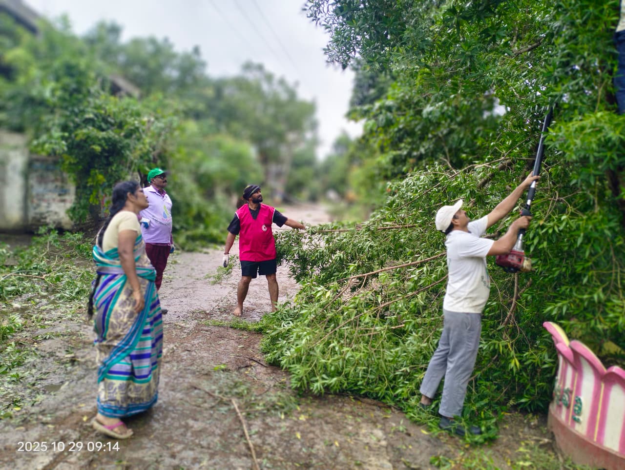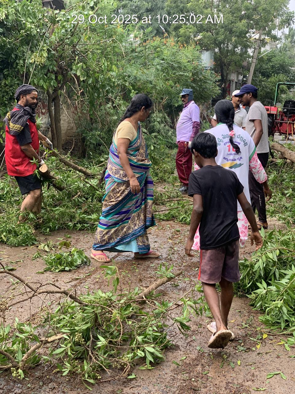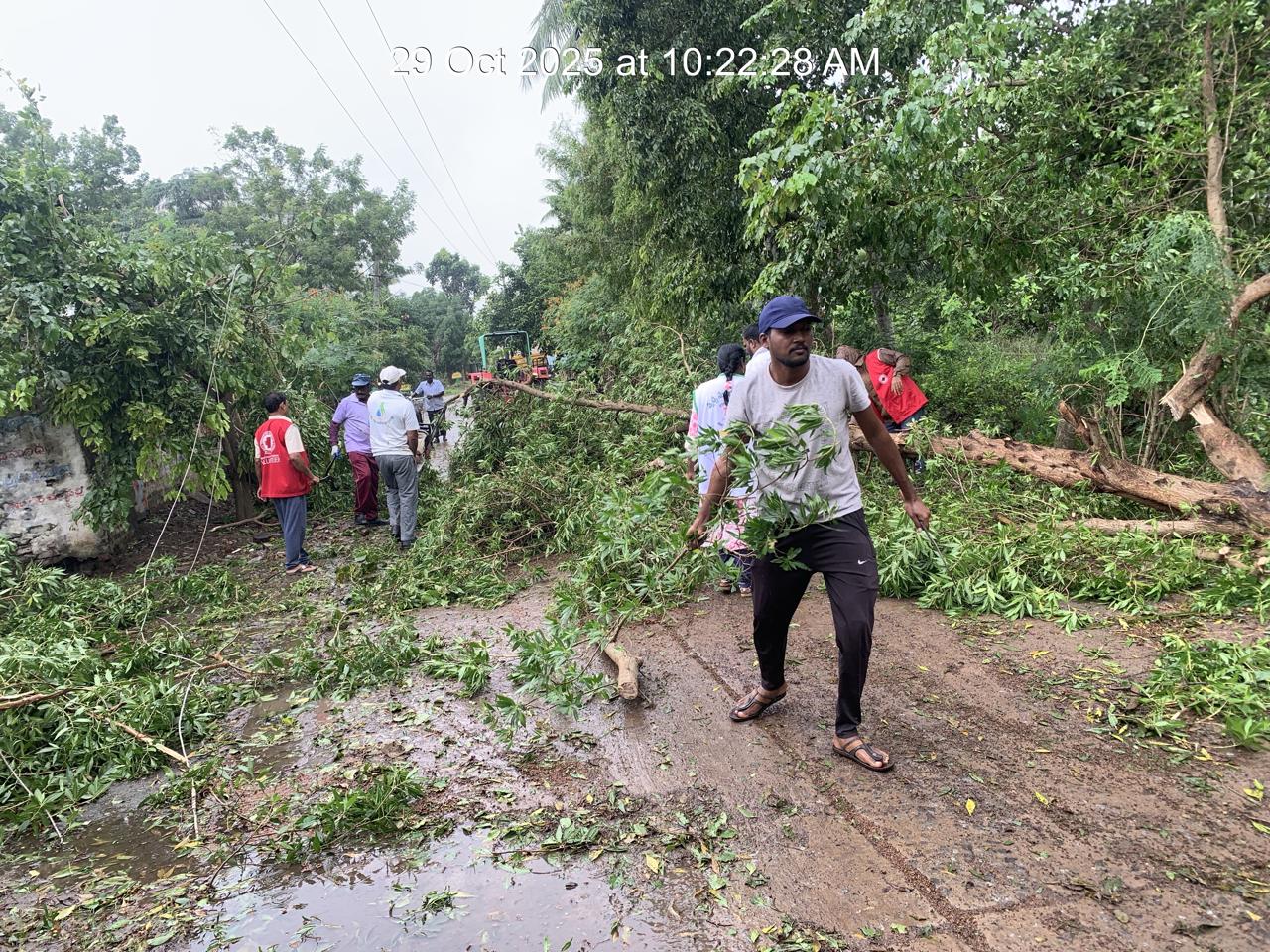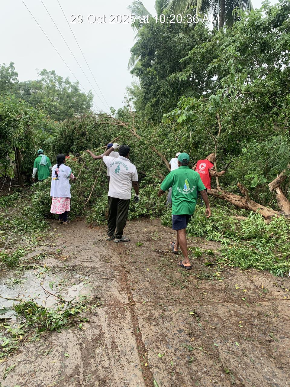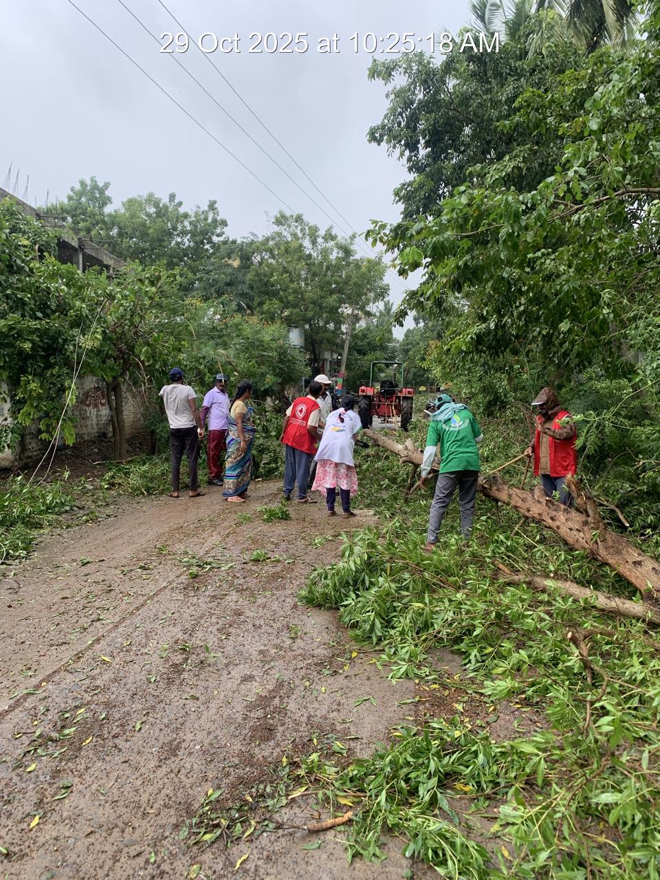 “మొంథా” తుఫాను ప్రభావంతో చల్లపల్లి నాల్గు చెరగులా అన్ని రహదారుల వెంబడి ఉన్న చెట్లు అక్కడక్కడా గాలికి నేలకొరగడంతో స్వచ్ఛ కార్యకర్తలు గాలి ప్రభావం కొంత తగ్గిన తరువాత శ్రమయుద్ధంలోకి దిగారు.