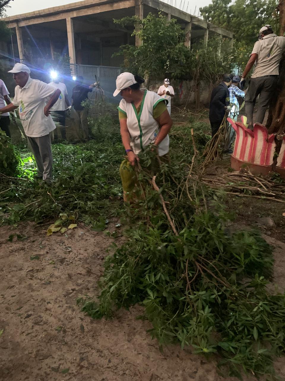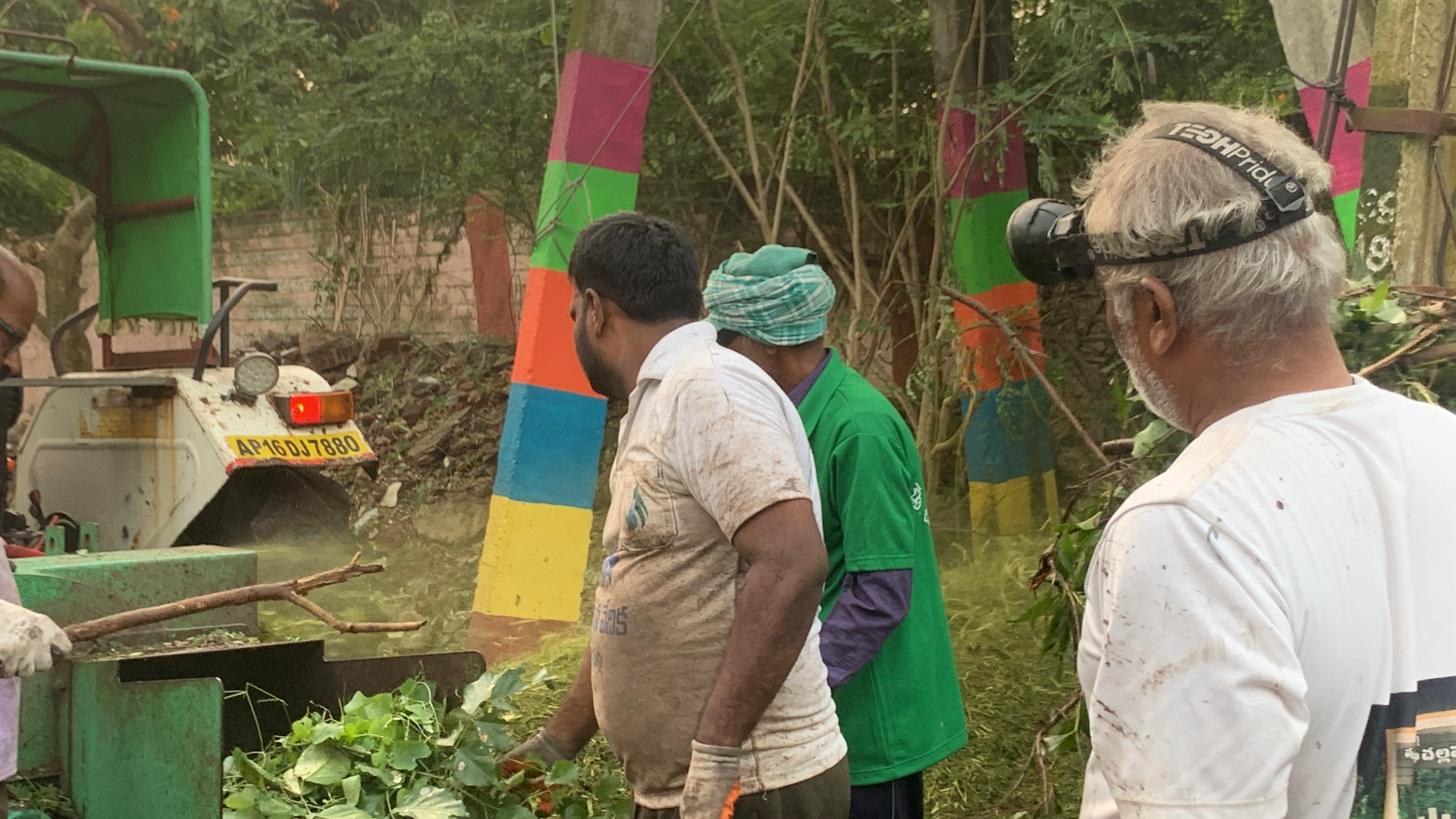 తుఫాను ప్రభావంతో 28 వ తేదీ సాయంత్రం నేలకొరిగిన చెట్లను అప్పుడు వర్షంలో తడుస్తూ ప్రక్కకు తొలగించి రహదారి సౌకర్యం కల్పించారు. కానీ అవి దాదాపు 4 ట్రక్కుల కొమ్మలు, ఆకులను డంపింగ్ యార్డ్ కు తరలిస్తే అక్కడ ఖాళీ ఆక్రమించడం తప్ప, తగలేస్తే కాలుష్యం ముప్పు వీటన్నింటికీ పరిష్కారంగా షడ్దర్ మిషన్ లో వేసి ఆకులు కొమ్మలను పొడి చెయ్యడం, మొద్దులను ఇతర అవసరాలకు కర్రలను మొక్కలకు దన్నుగా వాడడం ఇదీ రధసారది గారు కార్యకర్తలకు చెప్పిన ప్రత్యామ్నాయ పద్ధతి.