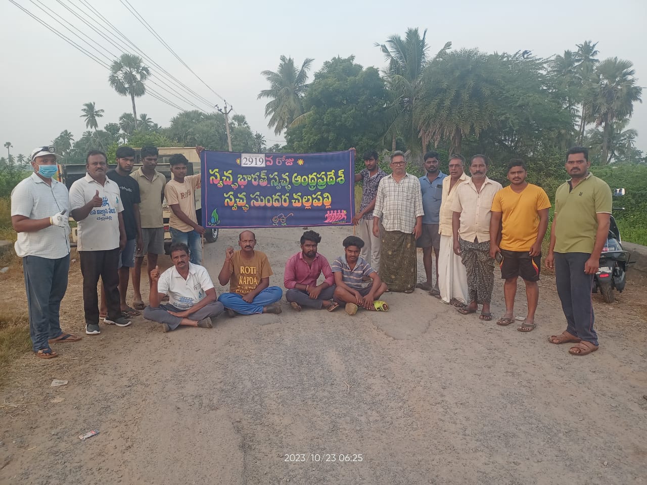 పర్యావరణ ధ్వంసకమయ్యే - కేవలం ఒక్కసారికే పనికి వచ్చే ప్లాస్టిక్కులు అందరం మానేద్దాం! అలుపెరుగని గ్రామ స్వచ్ఛ సుందరోద్యమం - @2923* ఈ గురువారం (27-9-23) వేకువ కూడ అది 4.16 కే ప్రారంభం! నిన్న ముగిసిన కస్తూరి మామ్మ ప్రాయోజిత ఉద్యానం దగ్గరే మళ్లీ నేటి 25 మంది (అసలు కార్యకర్తలు 23 గ్గురే గాని - ఆలస్యంగా వచ్చిన ట్రస్టు ఉద్యోగులతో కలిపి) శ్రమదానం! కాకపోతే నిమ్మల తోట వీధి దిశగానూ, అగ్రహారం 2 వ బాట వైపుగా...